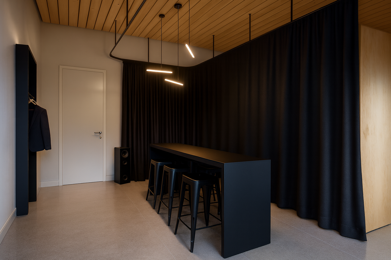 เมื่อก้าวเข้าสู่สตูดิโอ คุณจะสัมผัสได้ถึงความอบอุ่นจากวัสดุธรรมชาติอย่างไม้และโทนสีที่ให้ความรู้สึกสงบ